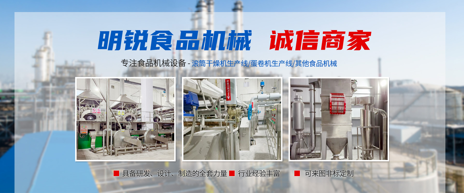 東臺(tái)市明銳食品機(jī)械有限公司是一個(gè)從事食品機(jī)械設(shè)備設(shè)計(jì)、制造和安裝調(diào)試的專(zhuān)業(yè)廠家,在食品生產(chǎn)工藝、生產(chǎn)流程及設(shè)備設(shè)計(jì)和制造有著多年豐富經(jīng)驗(yàn)。主要產(chǎn)品有蛋卷機(jī)生產(chǎn)系列,滾筒干燥機(jī)生產(chǎn)線系列以及其他食品機(jī)械。目前各種生產(chǎn)線規(guī)格齊全,國(guó)內(nèi)技術(shù)優(yōu)良,產(chǎn)品遠(yuǎn)銷(xiāo)亞洲各國(guó)及國(guó)內(nèi)二十多個(gè)省市自治區(qū)。